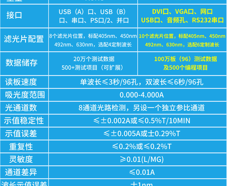 *滤光片配置:10个滤光片位置,标配405nm、450nm、492nm、630nm,选配6定制波长